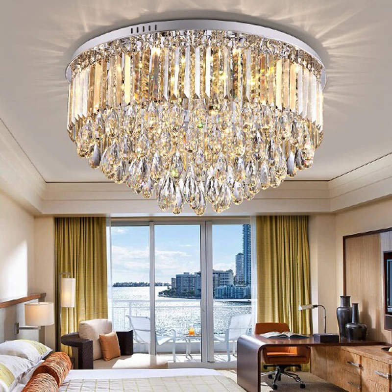 Востребованностью пользуются большие потолочные многоламповые конструкции, изготовленные из металла, хрусталя, дерева или стекла. Потолочные светильники уместно и гармонично смотрятся в больших помещениях.
