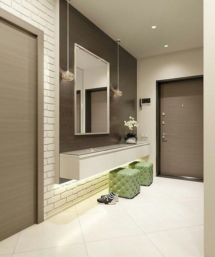 Белый. Площадь зала в этих типах зданий небольшая, поэтому их нужно всячески облегчать. Идея использования белого или родственных ему оттенков считается популярной, так как помогает визуально расширить пространство, придав ему свежести. Кроме того, на светлом фоне можно реализовать любые дизайн-проекты.