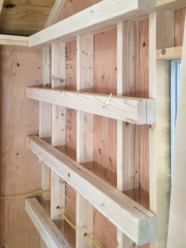 Закрепите стойку на стене, используя места, которые мы отметили ранее, и прикрутите ее к стене через эти направляющие отверстия. (Никогда не помешает в последний раз проверить, что это первый уровень.)