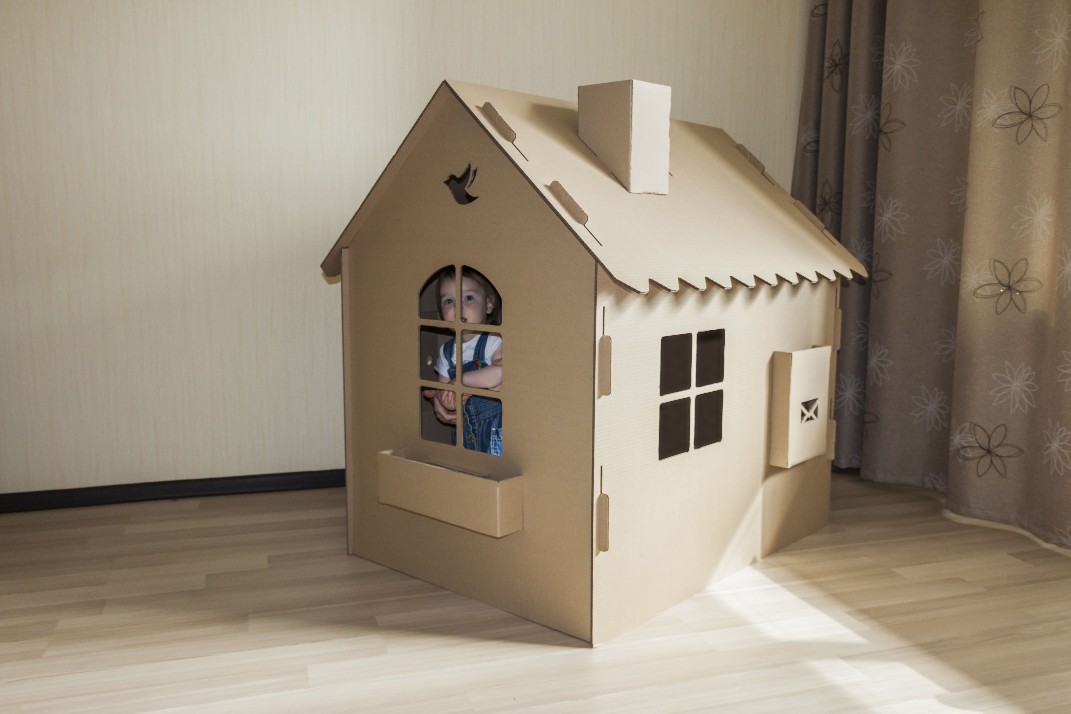 Картон позволяет делать любые, даже круглые конструкции. Нужно лишь запастись горячим клее, скотчем и канцелярским ножом. А как просто утилизировать потом игрушку! Сжег и все, нет хлама в доме!