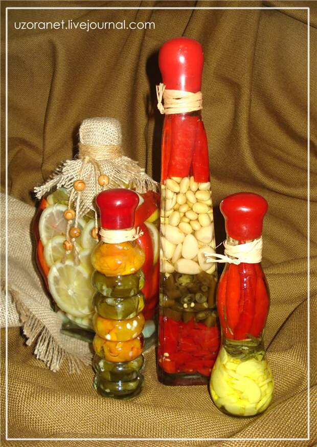 Но декоративное украшение для интерьера в них можно угадать по изящной форме бутылки и, художественно выложенным внутри ягодам или овощам. Такой предмет будет не только пробуждать аппетит, но и радовать глаз своим внешним видом.