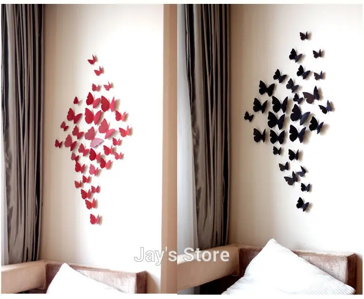 Наклейки на стены — еще один способ украсить стены бабочками. Обычно они изготавливаются из материала, похожего на пластик, например, из винила. Как плакаты и картины, они довольно недороги. Их также очень легко наносить и снимать со стены.