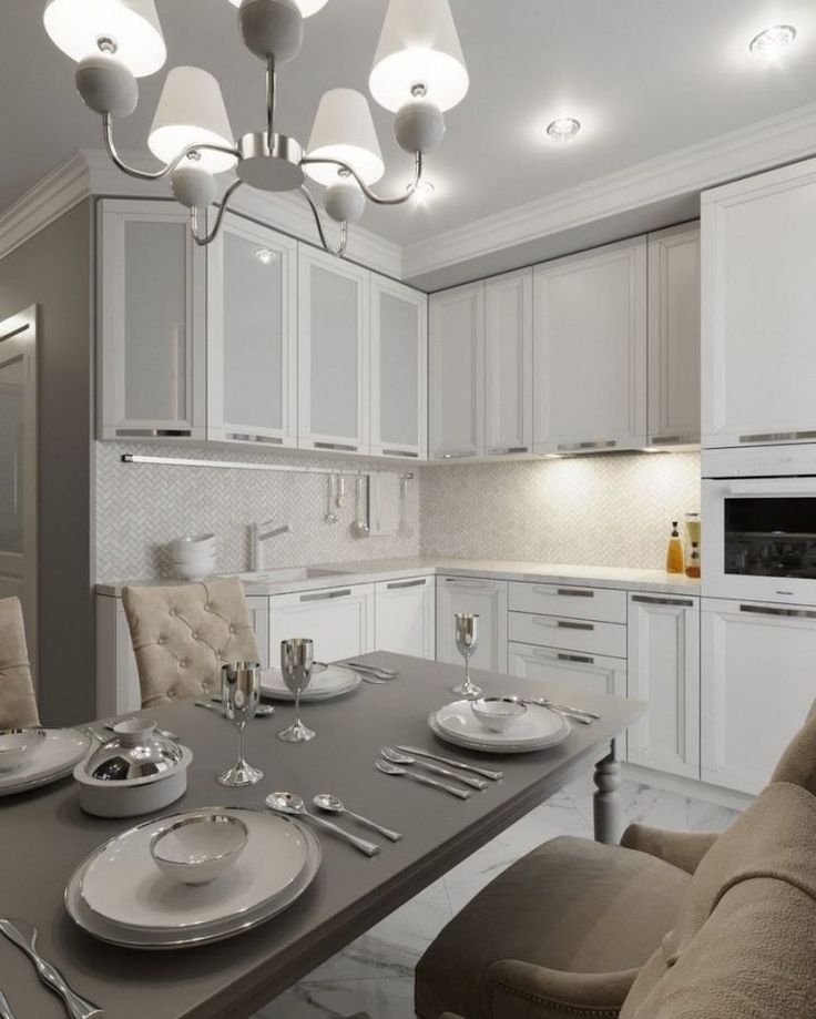 Белый цвет в интерьере продолжает сохранять свою актуальность. На 6 квадратных метрах кухонного пространства белый цвет дает возможность получить эффект визуального расширения пространства.