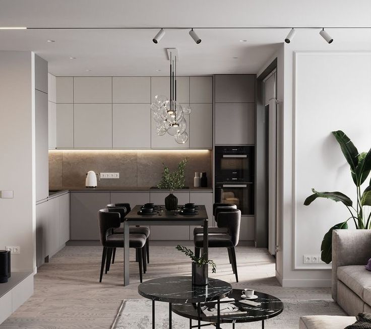 Простой, просторный и минималистичный кухонный потолок. Иногда они могут включать использование потолка того же цвета, что и стены, для придания непрерывной отделки.