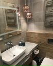 В санузле легко помещается полноразмерная ванна. Дизайнеры предлагают интересное решение, при котором сама ванна укомплектована раздвижными полками, переходящими в закрытый короб из гипсокартона, установленный за унитазом и биде. Вдоль противоположной стены предусмотрена широкая рабочая зона.