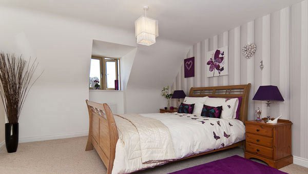 Обои пусть будут с розовым узором на белом фоне. Сиреневая постель наполнит гармонией, а шторы из прозрачной ткани добавят нежности.