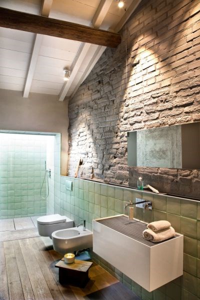 9. Ванная комната с открытой кирпичной отделкой и каменными полами отражает эклектическую атмосферу всей квартиры. Причудливые аксессуары, такие как деревянная лестница, винтажный стеклянный комод и цветы, подчеркивают атмосферу.