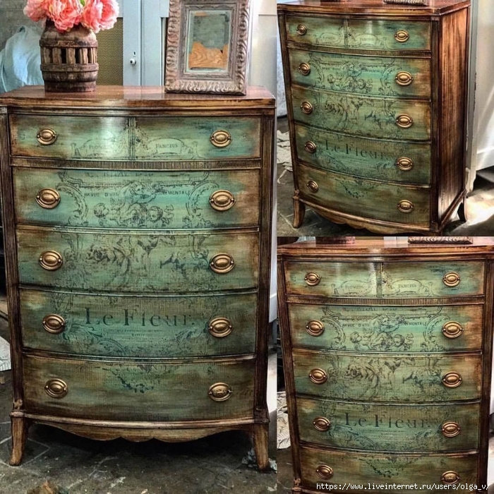 Для тех, кто не умеет рисовать, но комод с рисунком очень хочет, тоже есть выход: попробуйте свои силы в декупаже. А более подробно об этой технике для декорирования мебели вы можете прочитать в публикации Обновляем старую мебель. Декупаж.