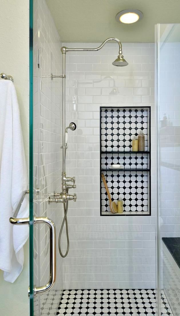 8. Контрастная напольная и настенная плитка в душевой