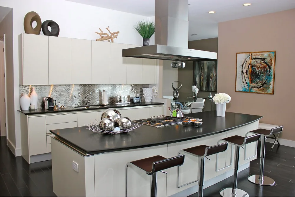 Выбор контрастных решений актуален при использовании в дизайне комнаты нескольких цветов. Так, фартук для белой кухни можно сделать и черным, если занавески белые с черным, стулья черные и стол белый.