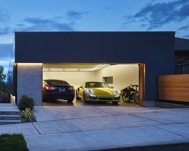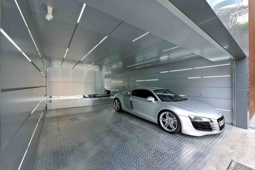 Отдельное внимание в лофте уделяют освещению: его должно быть много, чтобы подчеркнуть комбинацию роскоши и небрежности. Для гаража в стиле модерн характерны гладкие поверхности, обилие «начищенного до блеска» металла, дерево в декоре и простота в линиях