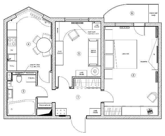 Важно: Подобную перепланировку согласовать будет непросто, так как положительное решение БТИ будет зависеть от этажа расположения квартиры и других конструктивных факторов. Кроме того, гостиная получится проходной.