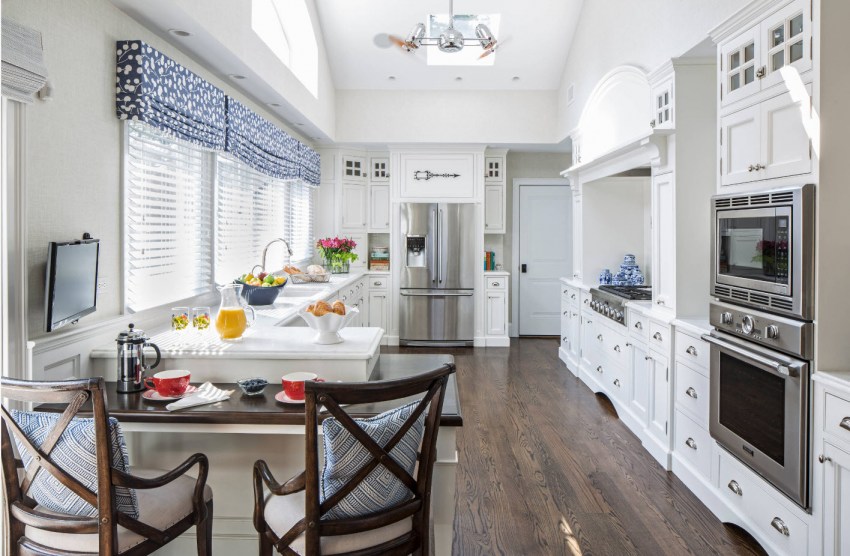 При выборе кухонных штор в 2020 году, стоит обращать внимание не только на модные новинки, но и на стилистические особенности помещения. Например, светлые длинные шторы в цветочек будут выглядеть неуместно на кухне в стиле хай-тэк. Рассмотрим особенности выбора фасона штор с учетом интерьера.