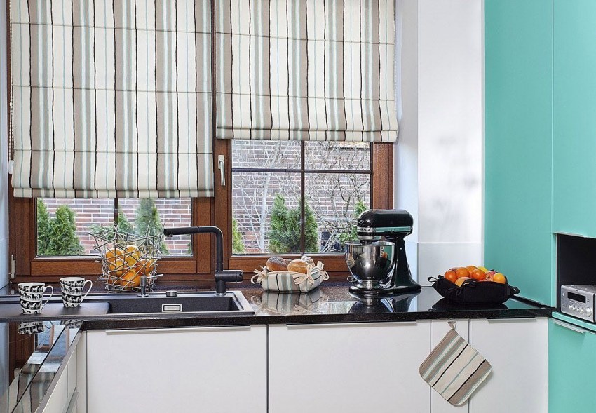 Если кухня совсем маленькая, то подоконник можно преобразовать в столешницу. Чтобы оконный текстиль не создавал неудобств, подойдет римская или рулонная штора.