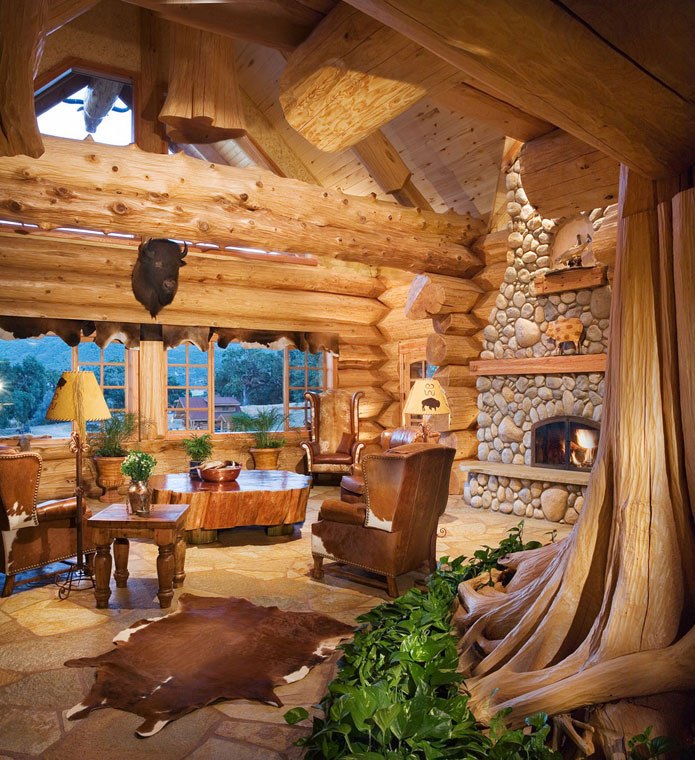 А хорошо прорисованную фактуру бревна или бруса позволит получить прокрашивание древесины водной краской. В результате помещение будет немного грубоватым, эксцентричным и неординарным;