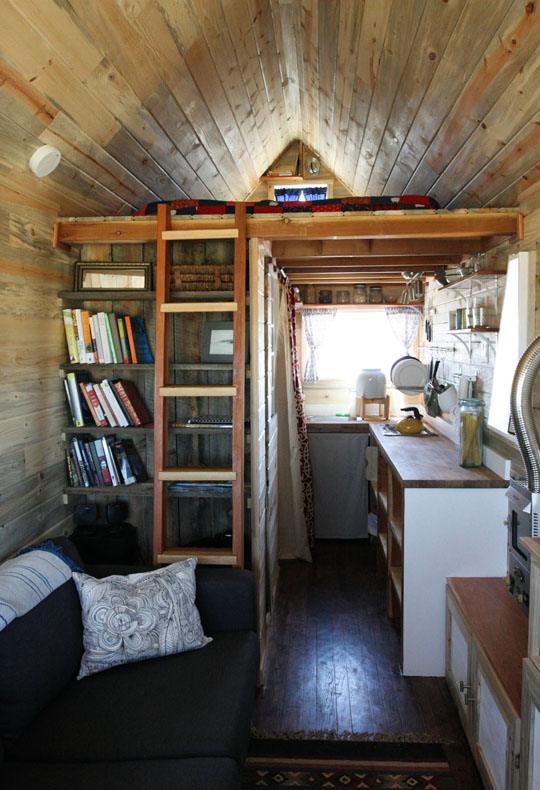 Лестница в качестве шкафа — довольно распространённый вариант хранения. Но что, если и этого мало? Поменяйте спальню и гостиную местами — пусть гостиная окажется на втором ярусе, а спальня на первом, скрытая перегородкой под лестницей. Идея работает для домиков с невысокими потолками, когда второй ярус находится на высоте не более двух метров. Так у вас появится отдельное место для отдыха, для приёма гостей, и освободится площадь для хранения.