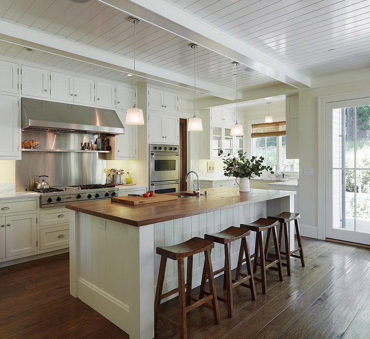 В частном доме этот параметр не играет роли. Но подбирают практичный и долговечный материал. В загородном жилище хозяин может оформить кухню в любом стиле — от классического до хай-тека, китайского или арабского. Потолок покрывают гипсокартоном, штукатуркой, побелкой, обоями, краской, вагонкой и даже текстильными гобеленами. Важно то, чтобы материал не пропускал наружу тепло, а сохранял его внутри дома.