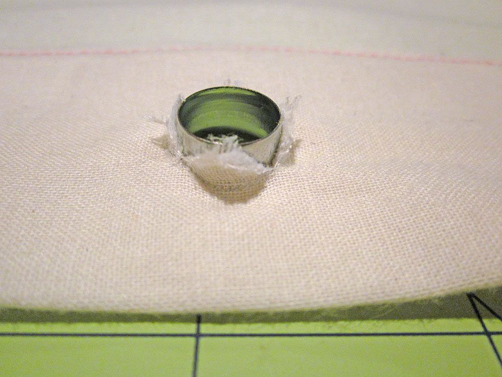 В подготовленные ранее отверстия на брезенте с двух сторон, противоположно друг другу, помещаются блочка и кольцо, после чего при помощи развальцовки и молотка они надежно фиксируются на материале.