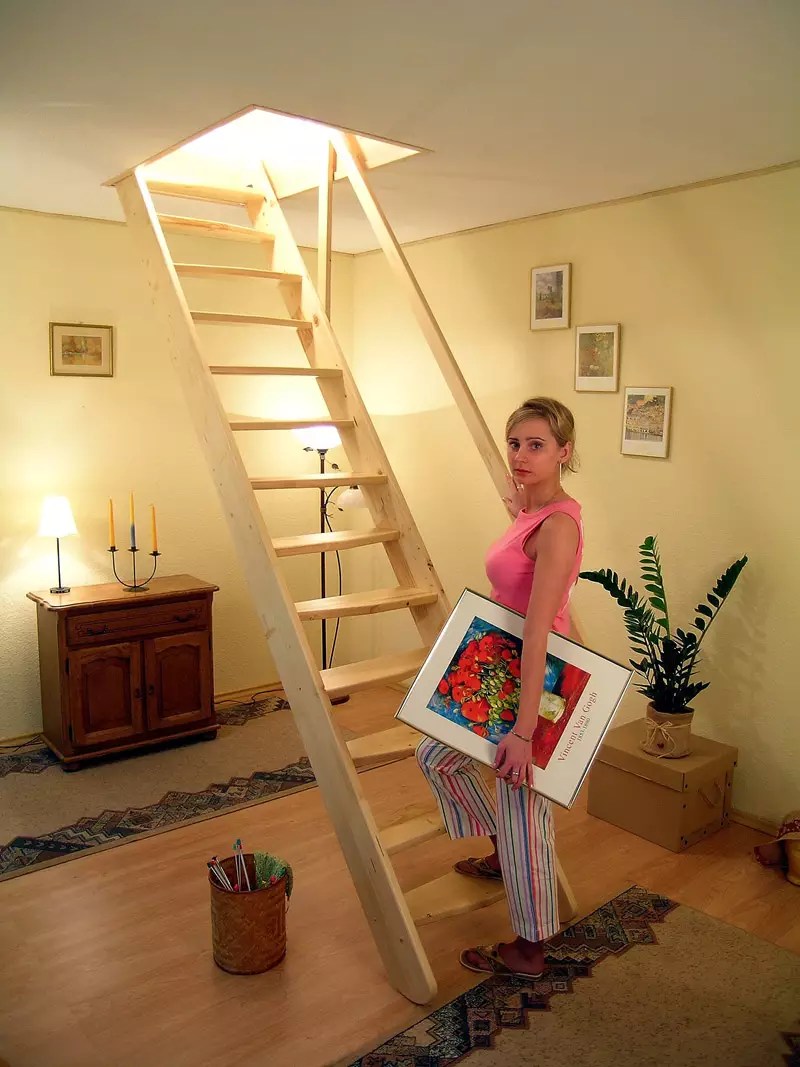 Если подниматься наверх приходится нечасто, лучше установить в загородном доме конструкцию раскладного типа. Она отлично подходит для мансарды. Ее преимуществом является возможность складывания при необходимости. Малогабаритные выдвижные модели прикрепляют к люку на потолке. Можно легко откинуть конструкцию, а затем задвинуть ее обратно. Для обслуживания чердака раскладная конструкция – идеальный вариант.