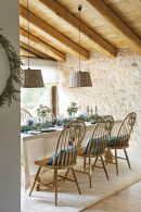 Актуальной мебелью является массивный обеденный стол с табуретами, стульями или деревенскими лавками. Интерьер в рустике также обставляют креслами и кроватями с бревенчатым каркасом, открытыми полками и тумбами из дерева.
