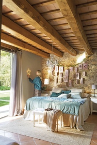 Текстильная составляющая стиля рустик не так уж и велика. Она ограничивается занавесками на окнах, подушками и тёплыми покрывалами на кровати, домоткаными ковриками или циновками на полу.
