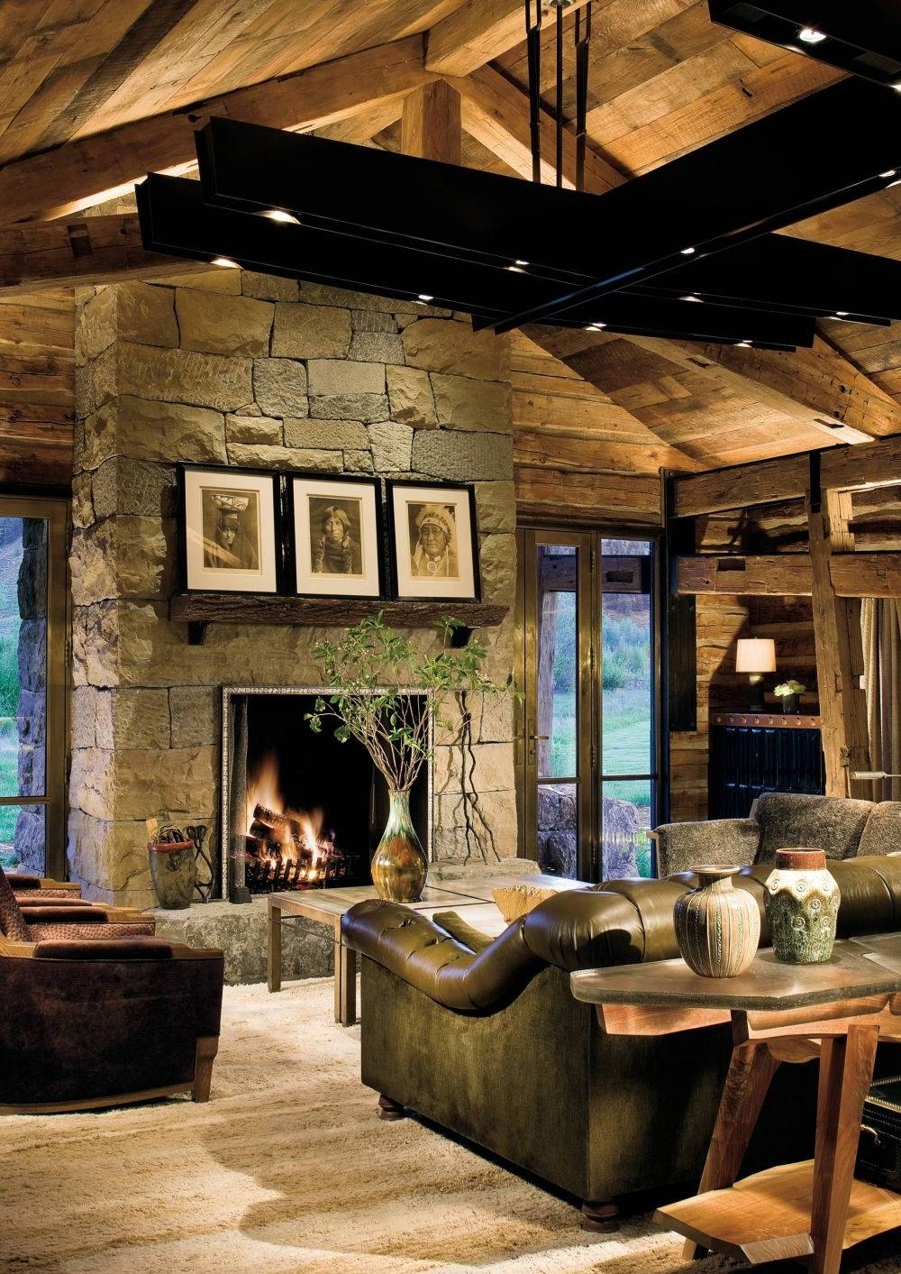 Зачастую древесина в таком интерьере соседствует с натуральным камнем.