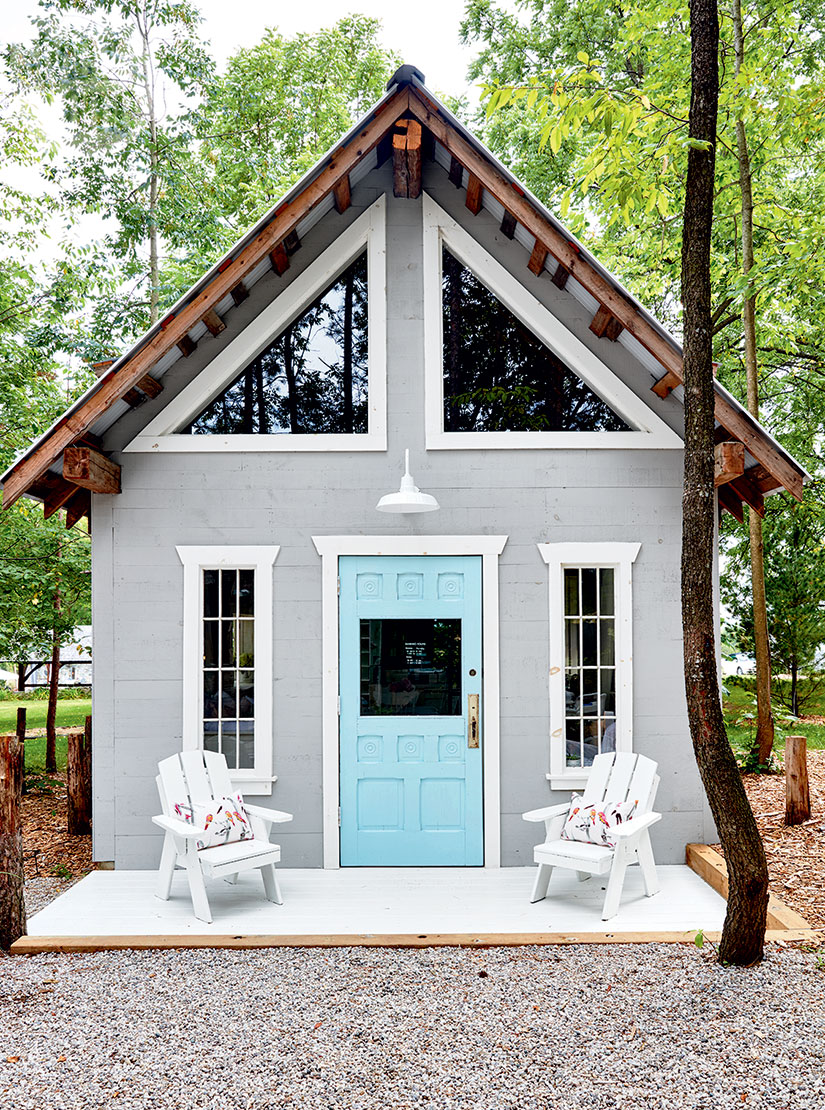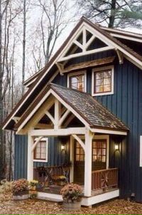 Отделка деревом создает готическую атмосферу с ярко-синей крышей.