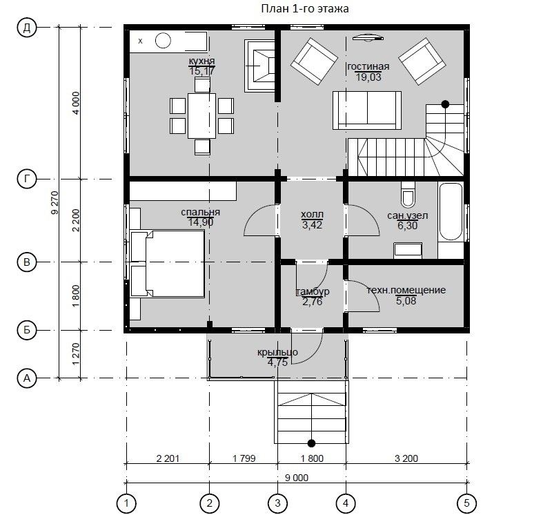 Проект одноэтажного дома из бруса 8 на 9 — ДБ 44