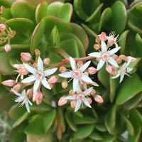 В природных условиях растение начинает зацветать с приходом первого весеннего тепла. В домашних условиях толстянка древовидная радует хозяев цветением очень редко. Соцветия выглядят в виде пятилепестковых звездочек нежного розоватого тона. Цветки соединяются в пазушные кистеобразные бутоны. По завершению периода цветения наступает формирование маленьких овальных плодов. Их диаметр не превышает обычно 6 мм. Внутри прячутся мелкие зернышки.