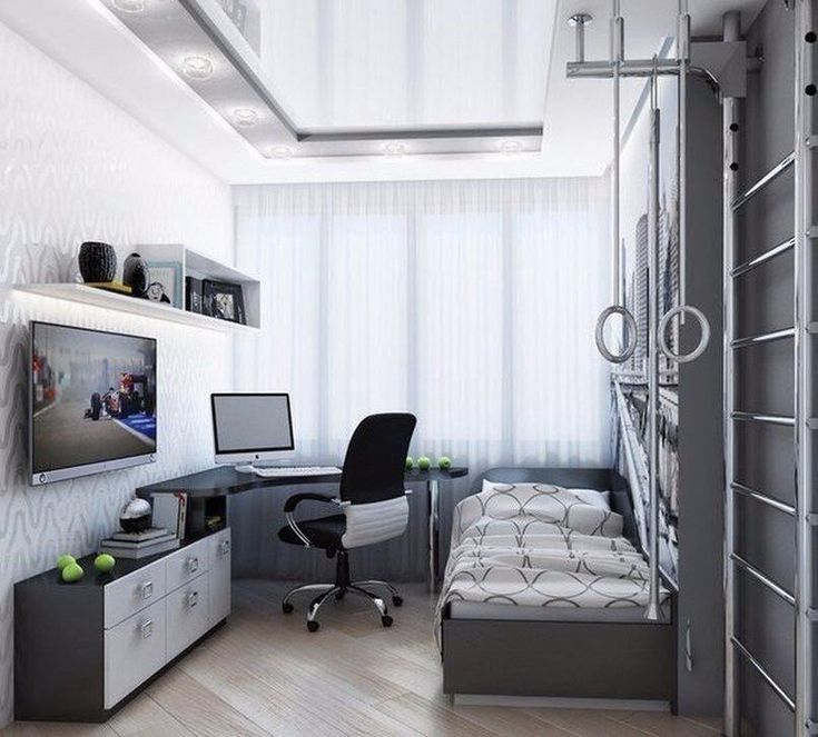 Возможны два варианта зонирования комнаты. В первом случае рабочее место располагается в углу и составляет одно целое со спальней. Кровать ставится возле окна, напротив стола. Кроме того, можно создать небольшой кабинет, отделив рабочую зону декоративной перегородкой или стеллажом.