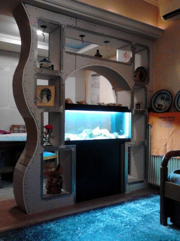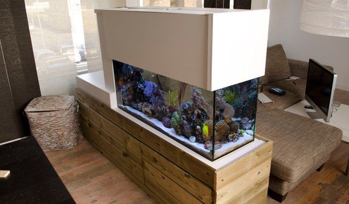 Помимо эстетической ценности вашего дома, аквариумы могут быть и функциональными. Длинный горизонтальный аквариум может стать отличным способом разделить комнату на два пространства. Дизайн аквариума для перегородки может быть таким же простым, как установка коробчатого аквариума на деревянную основу или размещение его между двумя секциями перегородки. В любом случае аквариум сконструирован таким образом, что рыбок видно с обеих сторон.