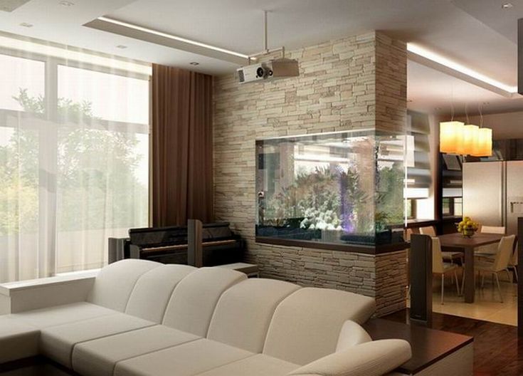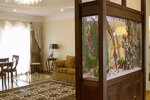 Этот вариант установки является классическим. Главное — подобрать конструкцию под стиль интерьера. Перегородка может быть декоративной, тогда она служит лишь для установки аквариума и не доходит до потолка. Сегодня продаются даже готовые простенки с аквариумами, которые устанавливаются на месте. Часто гостиная граничит с зоной кухни, в этом случае можно использовать узкий, но довольно высокий аквариум.