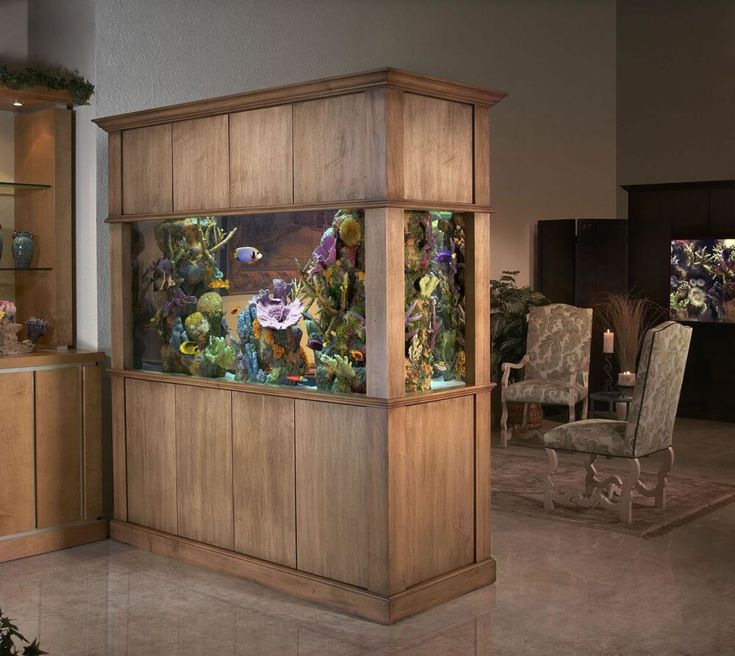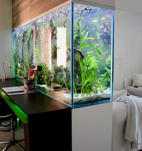 Людям, которые используют аквариумы с тропическими рыбками в качестве разделителей пространства в своих домах, нравится эта идея, и они говорят, что аквариумы — это красивые перегородки, которые хорошо подходят для всех интерьеров — детских комнат и семейных комнат, гостиных и домашнего офиса.