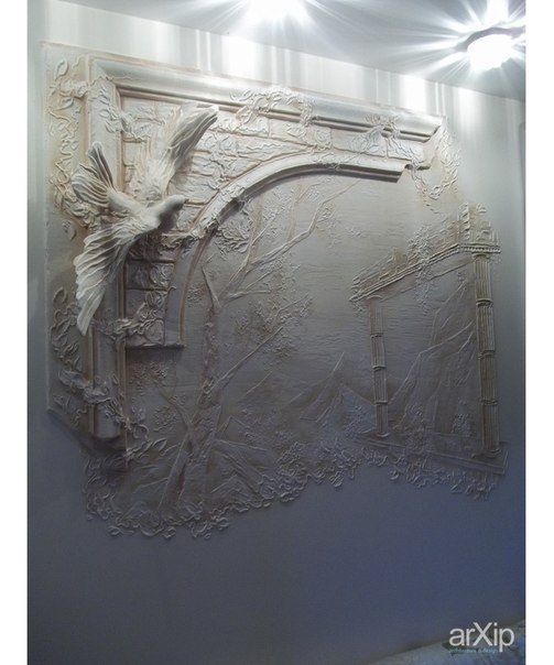 Барельеф в интерьере выглядит очень изысканно и оригинально. В комнате создается особый шарм. Это отличный вариант для декора пустой стены, либо маскировки ее неровной поверхности. К тому же, композицию подобрать можно под свой, индивидуальный вкус. И воссоздать ее, прямо на стене, своими руками.