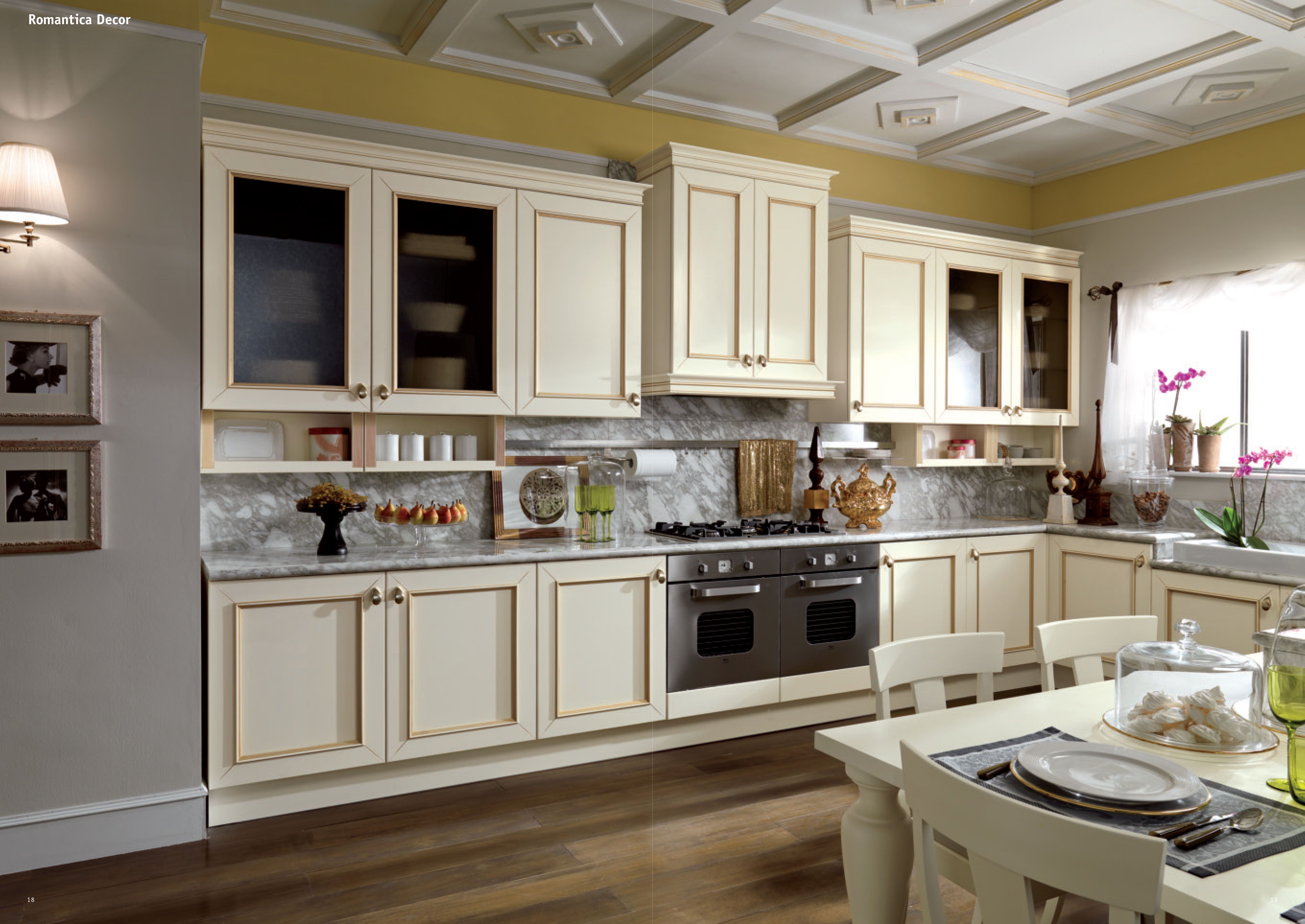 Эти кухни предпочитают натуральные материалы, обшитые панелями фасады шкафов, мягкую палитру с кремовым оттенком, слоновой кости и кремового цвета, детализированные карнизы и молдинги, а также декоративные светильники. Также часто можно увидеть нестандартные вытяжки.