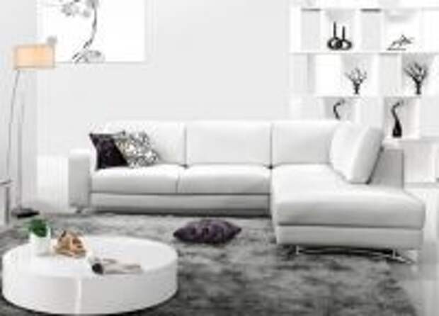 На фото большой угловой белый диван с кожаной обивкой.