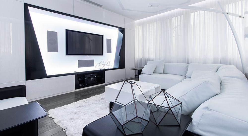 Если в бело-черную палитру владелец гостиной добавит серебристые нотки, то ему удастся добиться стиля хай-тек.