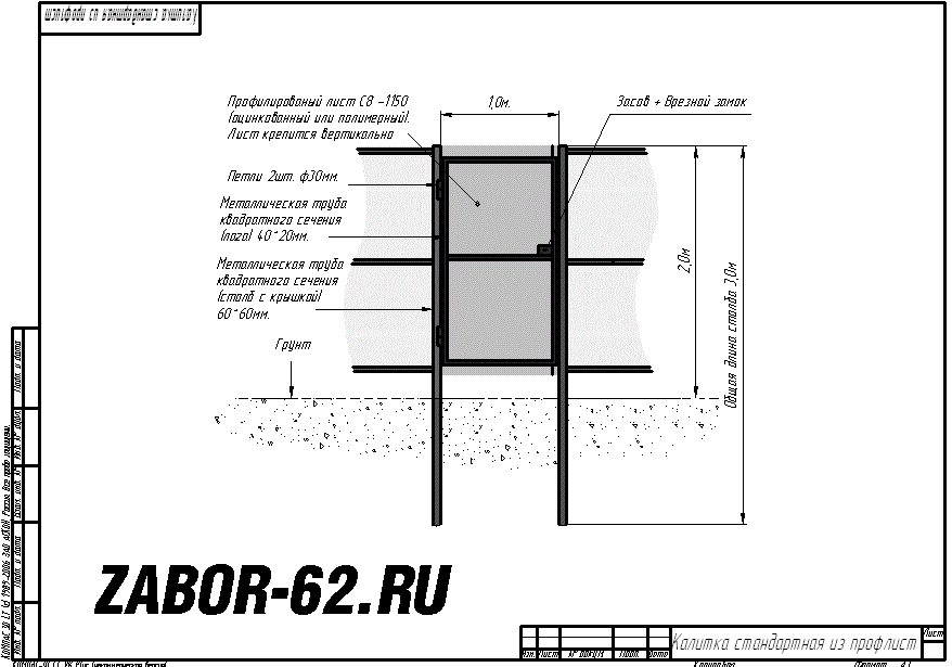Театр начинается с вешалки, а любая конструкция – с расчётов и чертежа. Ширина калитки должна обеспечивать свободный проход людей с малогабаритными вещами. Для этих целей достаточного 1 метра. При больших габаритах увеличивается парусность и вес конструкции, что потребует монтажа более двух петель, а также необходимо будет ставить дополнительный запор и устанавливать трубы большего диаметра.