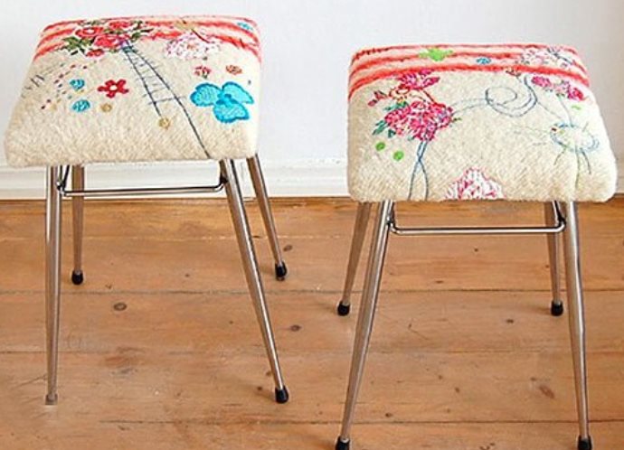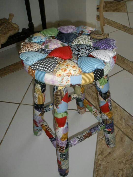 Кладем стул сиденьем вниз на синтепон. По контуру верхней части табурета, обрезаем синтепон. Приклеиваем деталь к изделию.