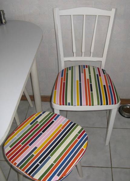 Ткань хорошо тянется, нужно следить, чтобы она плотно прилегала к стулу, для этого не оставляйте припуск на шов.