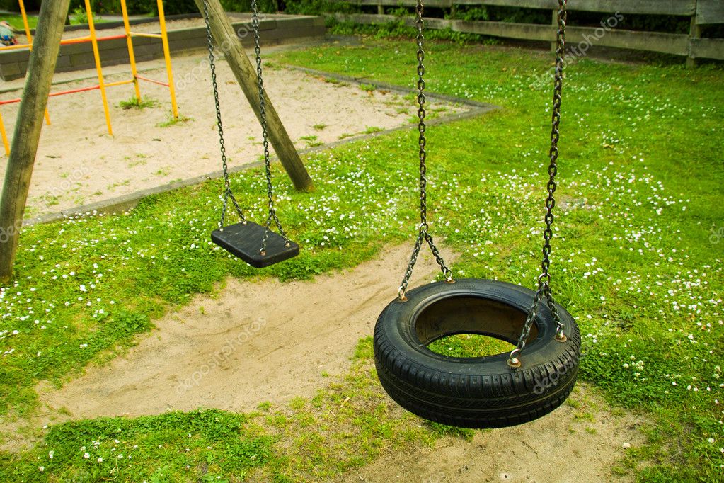 Обычные качели, в форме привязанного на канате колеса, уже не в моде. При помощи ножа из покрышки можно вырезать лебедя – такие качели больше понравится ребёнку. Если же хочется чего-то попроще, разрезаем колесо на два полукруга (здесь понадобится болгарка) и крепим на них отрезки фанеры. Желательно такую качалку оборудовать ручками.