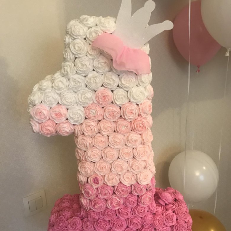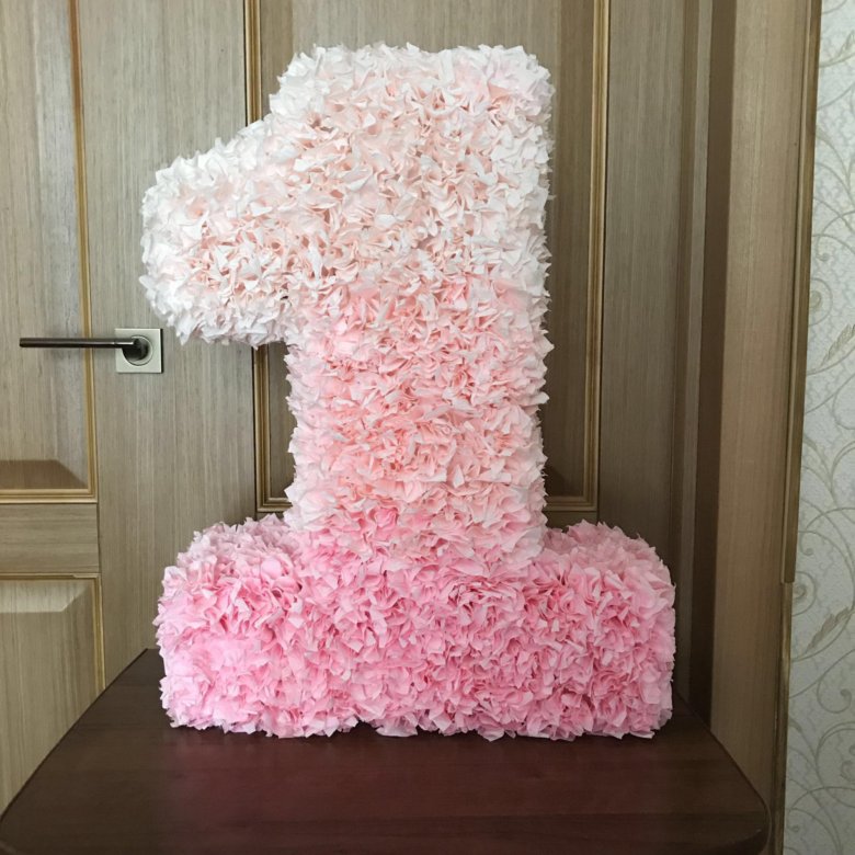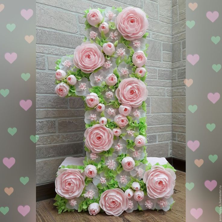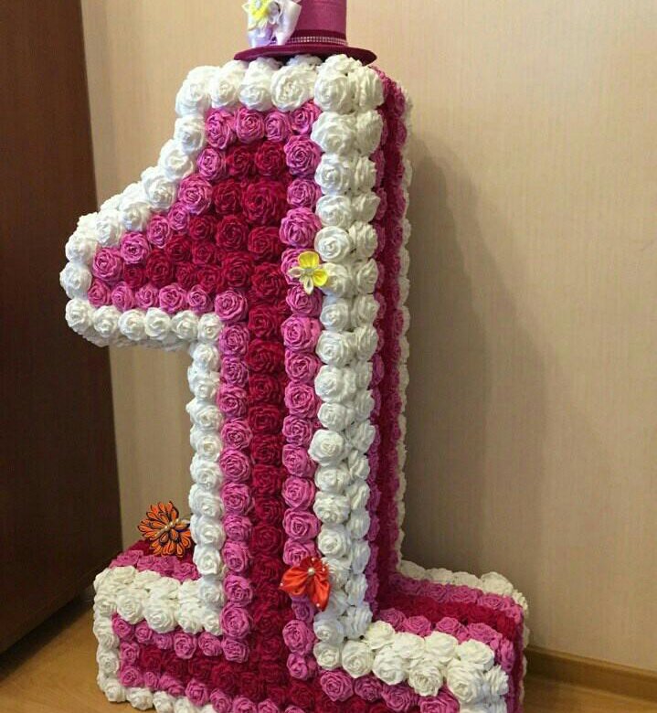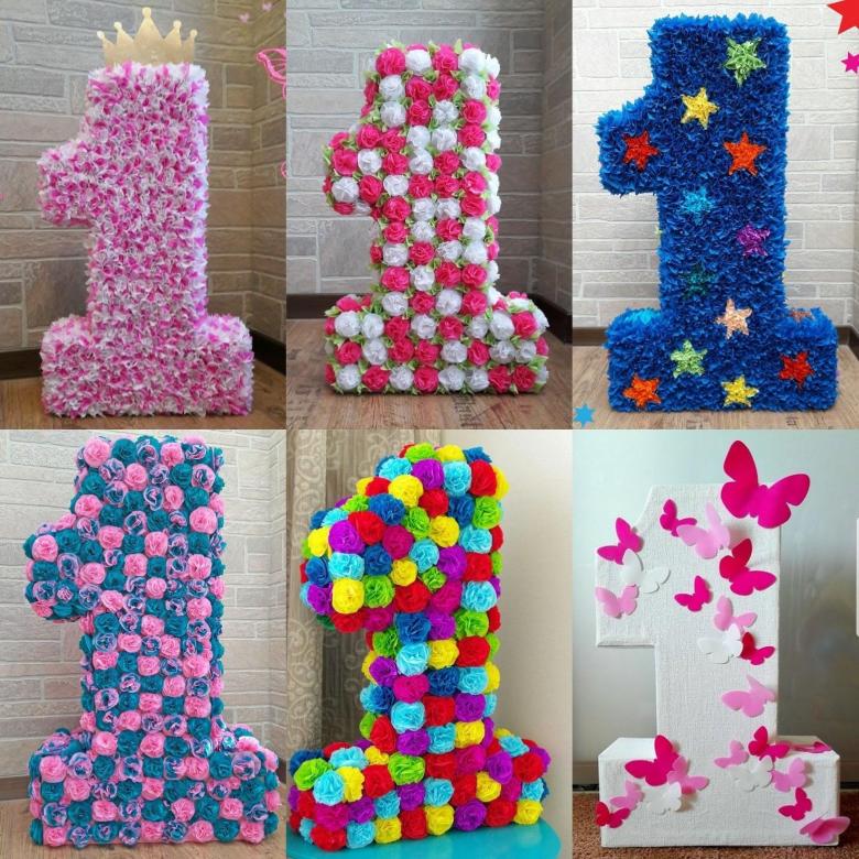 Изготовить красивую цифру на день рождения ребенка можно, применив соответствующую технику. Цветочки из бумаги, закрепленные на картонном каркасе, создадут желаемую композицию.