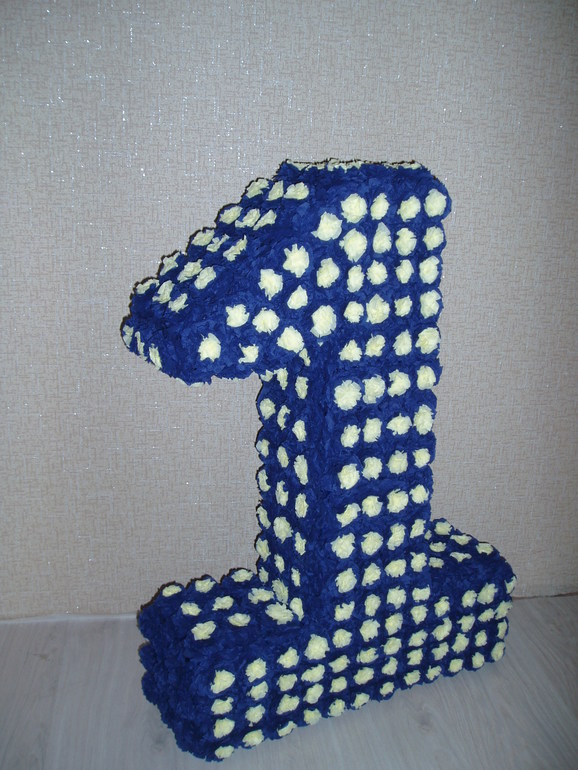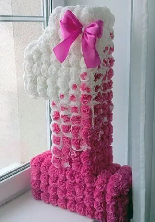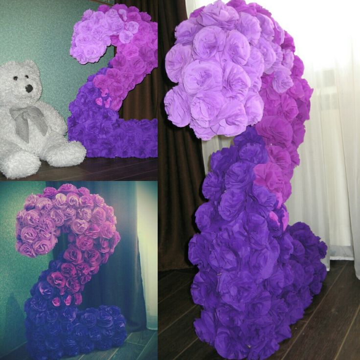 Для декора используется любая тонкая бумага. Можно украсить цифру большими помпонами, объемными или плоскими цветами, бахромой и так далее. Для фигурки большого размера понадобится около 100-200 роз из бумаги. Это сообщаем вам для понимания масштабности работы. Желательно выбирать пышные цветы, например, розы или астры.