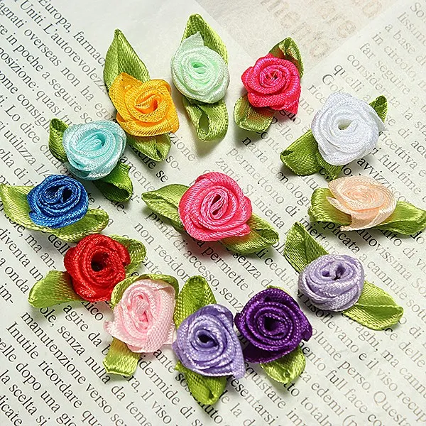 1/2 «белая мини-роза из атласной ленты с аппликацией в виде листьев — упаковка из 288 шт.
