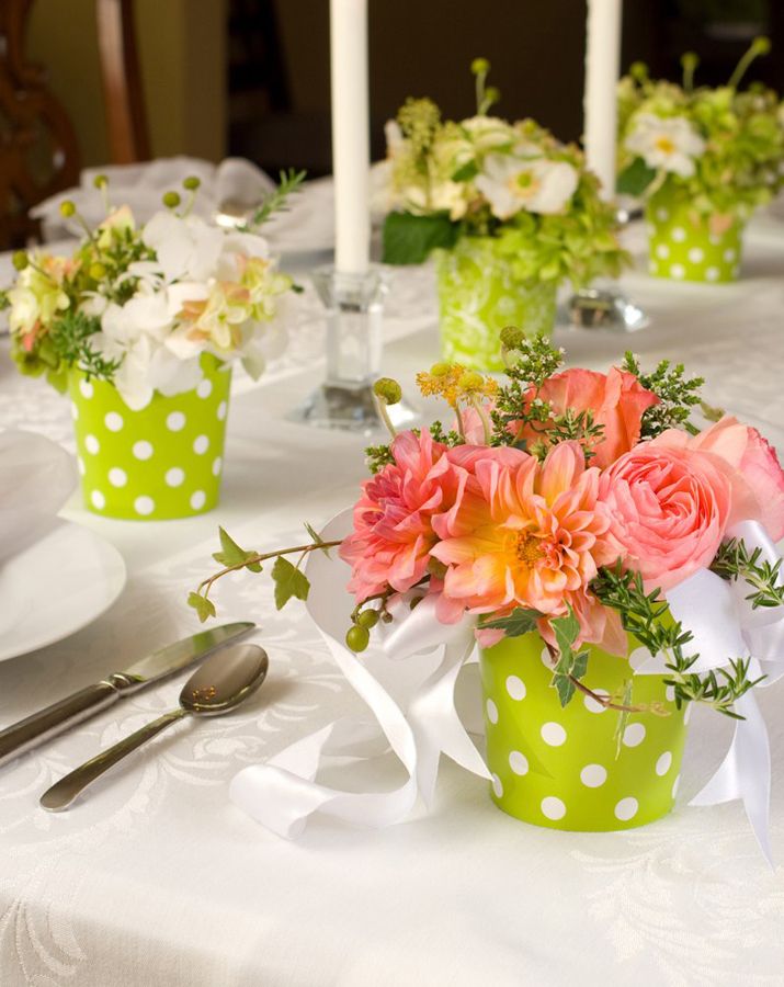 Цветочную композицию можно разместить на пирожковой тарелке, на салфетке или в небольших вазочках возле приборов.