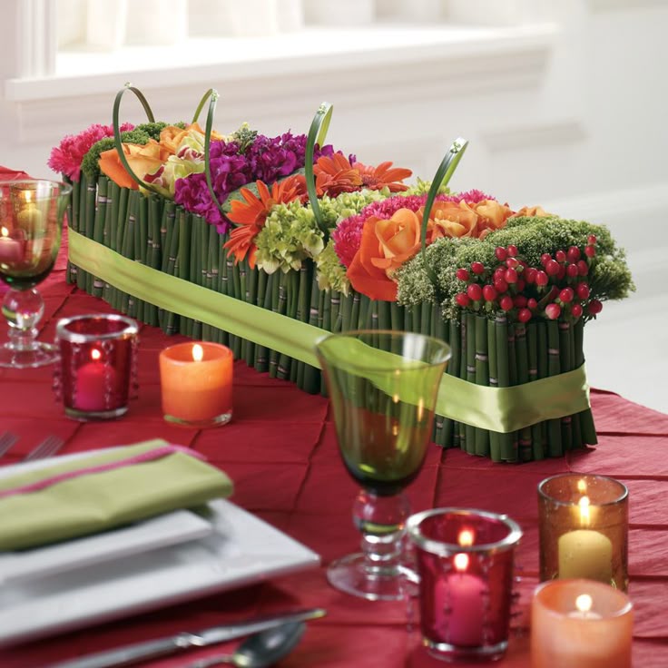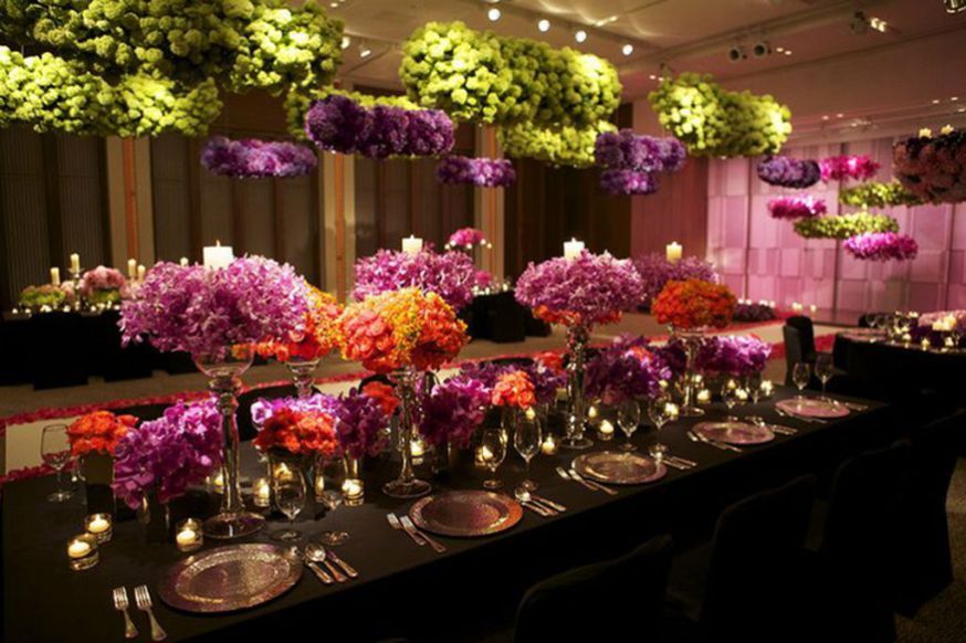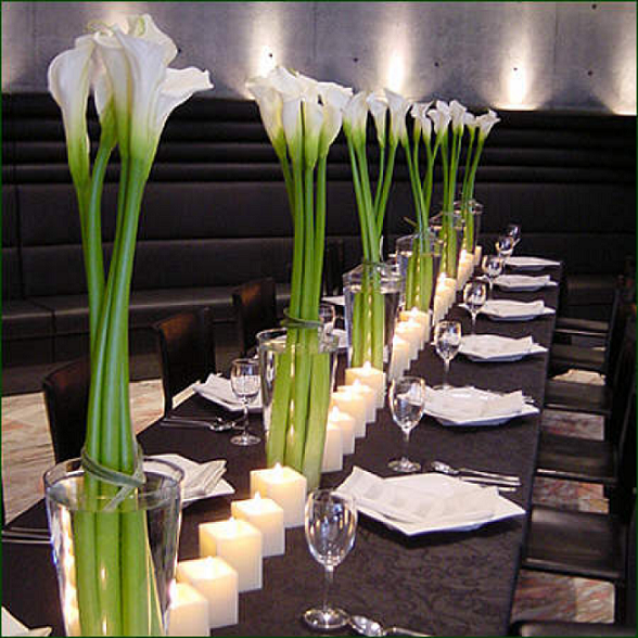 1. Если вы решили разместить один большой букет по центру длинного стола, вы должны учитывать несколько флористических хитростей:
