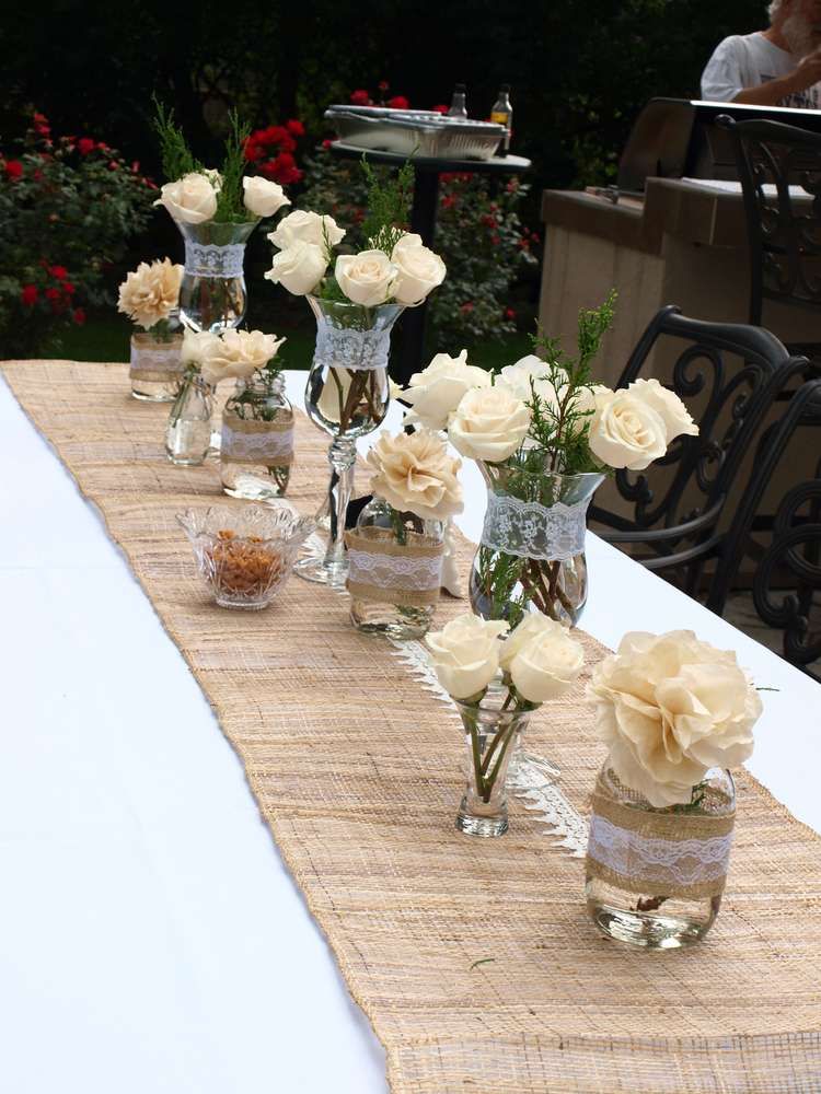 Для этой свадьбы на открытом воздухе в Калифорнии кремовые и белые сушеные аммобиумы были помещены в банки Мейсона, которые были перевязаны шпагатом для придания непринужденного вида.