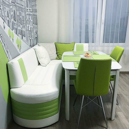 Зеленая мебель способна добавить в атмосферу яркости и свежести. Небольшой диван на кухне может стать своеобразным оазисом.