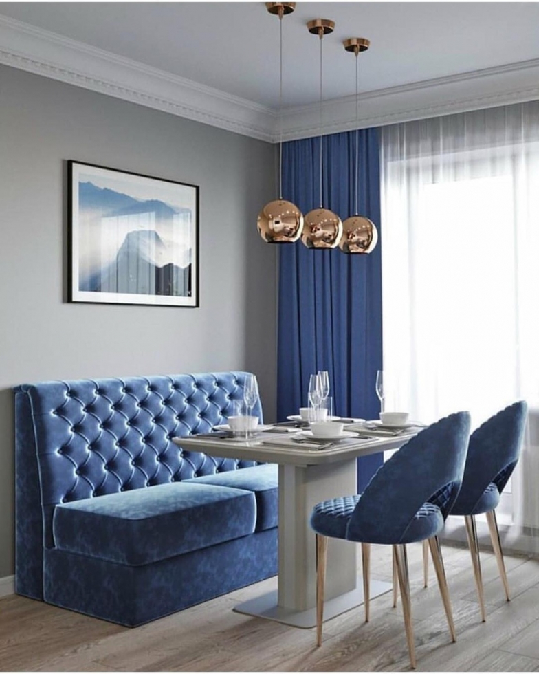 Если небольшой диван является еще и спальным местом на кухне, то расслабляющий синий цвет будет как нельзя кстати. Выберите красивое небо или темно-синий цвет и наслаждайтесь комфортом и покоем.