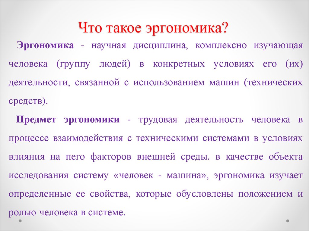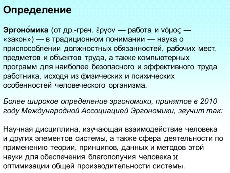 Эргономика (или человеческий фактор) — это научная дисциплина, связанная с пониманием взаимодействия между людьми и другими элементами системы, а также профессия, которая применяет теорию, принципы, данные и методы для проектирования с целью оптимизации благополучия человека и в целом. производительность системы (определение, принятое Международной эргономической ассоциацией в 2000 г.).